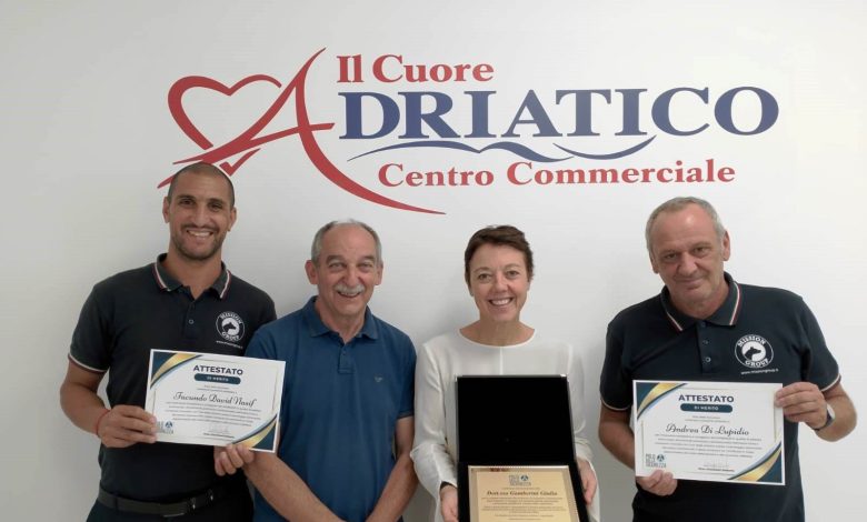 Il presidente del Polo della Sicurezza di Monteprandone, Umberto Cuccioloni, ha consegnato un attestato di merito a Facundo David Nasif, Andrea Di Lupidio e Mirko Mazzotta, i  tre addetti alla sicurezza che hanno gestito con prontezza l’incendio divampato lo scorso mese, nel parcheggio sotterraneo del Centro Commerciale Cuore Adriatico di Civitanova Marche.