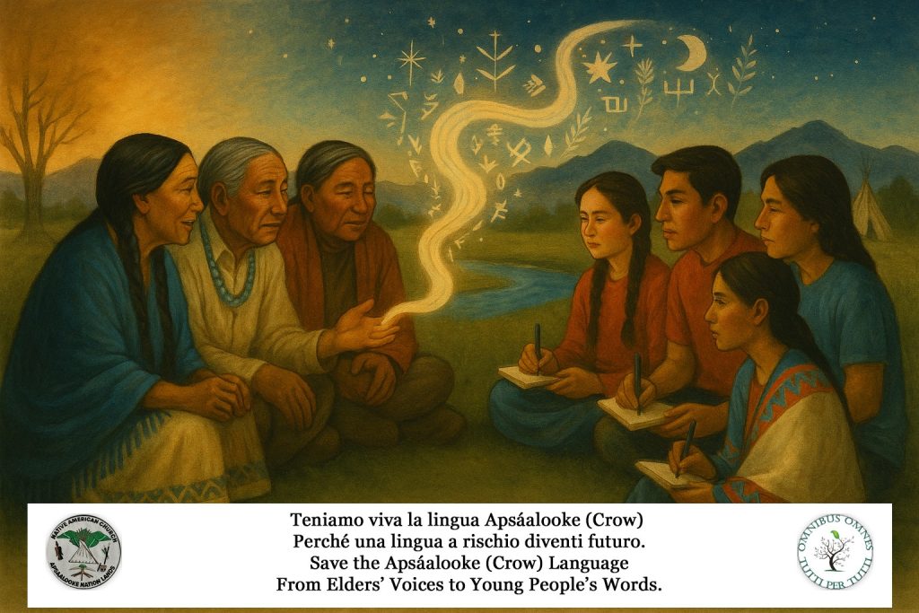 Le lingue indigene sono fra i patrimoni culturali più fragili e strategici del pianeta. L’ONU ha proclamato il Decennio Internazionale delle Lingue Indigene 2022–2032 per mobilitare governi, istituzioni e società civile nella loro tutela, rivitalizzazione e promozione. È in questo quadro che nasce “Teniamo viva la lingua Apsáalooke (Crow)”, campagna di raccolta fondi e sensibilizzazione promossa dalla associazione sambenedettese Omnibus Omnes OdV in favore di NACANL (Native American Church of Apsáalooke Nation Lands).